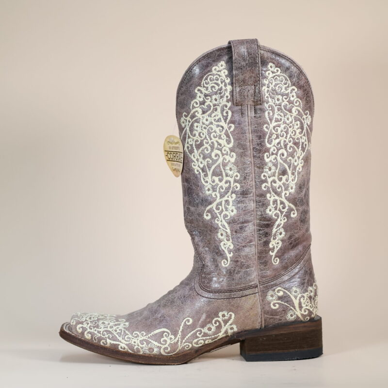 A2663 – WOMEN’S BONE COLOR FLORAL EMBROIDERY SQUARE TOE COWBOY BOOT