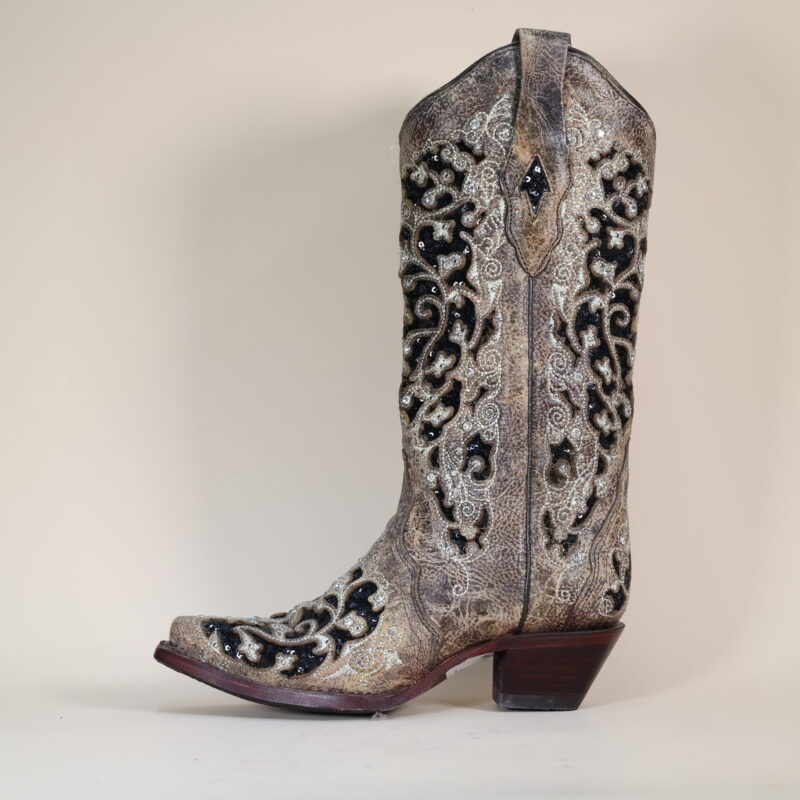 A3326 – WOMEN’S TAN INLAY EMBROIDERY AND STUDS BROWN SQUARE TOE COWBOY BOOT
